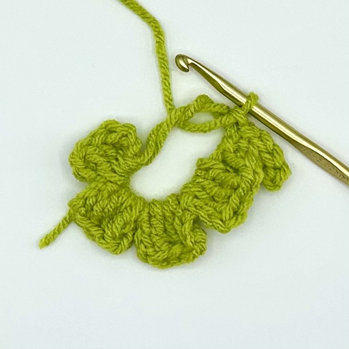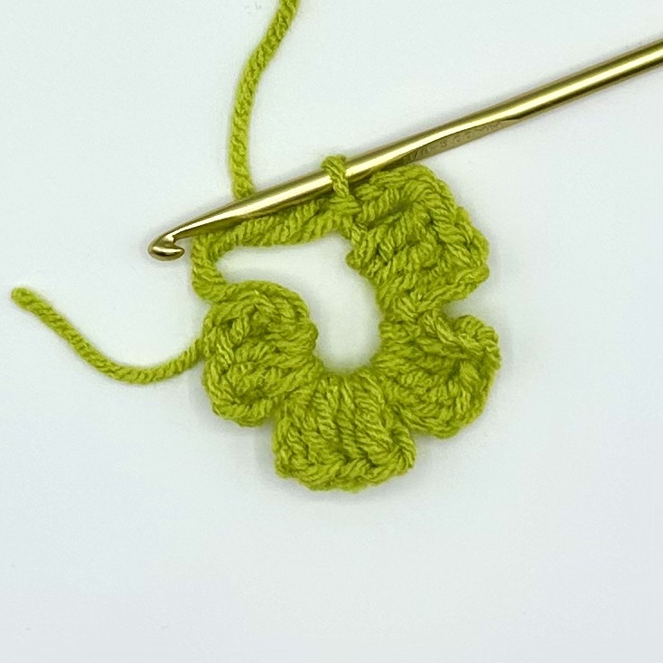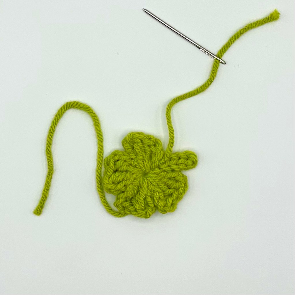 Flip the clover over to its backside. Knot the yarn end and working yarn together. Weave in the ends.