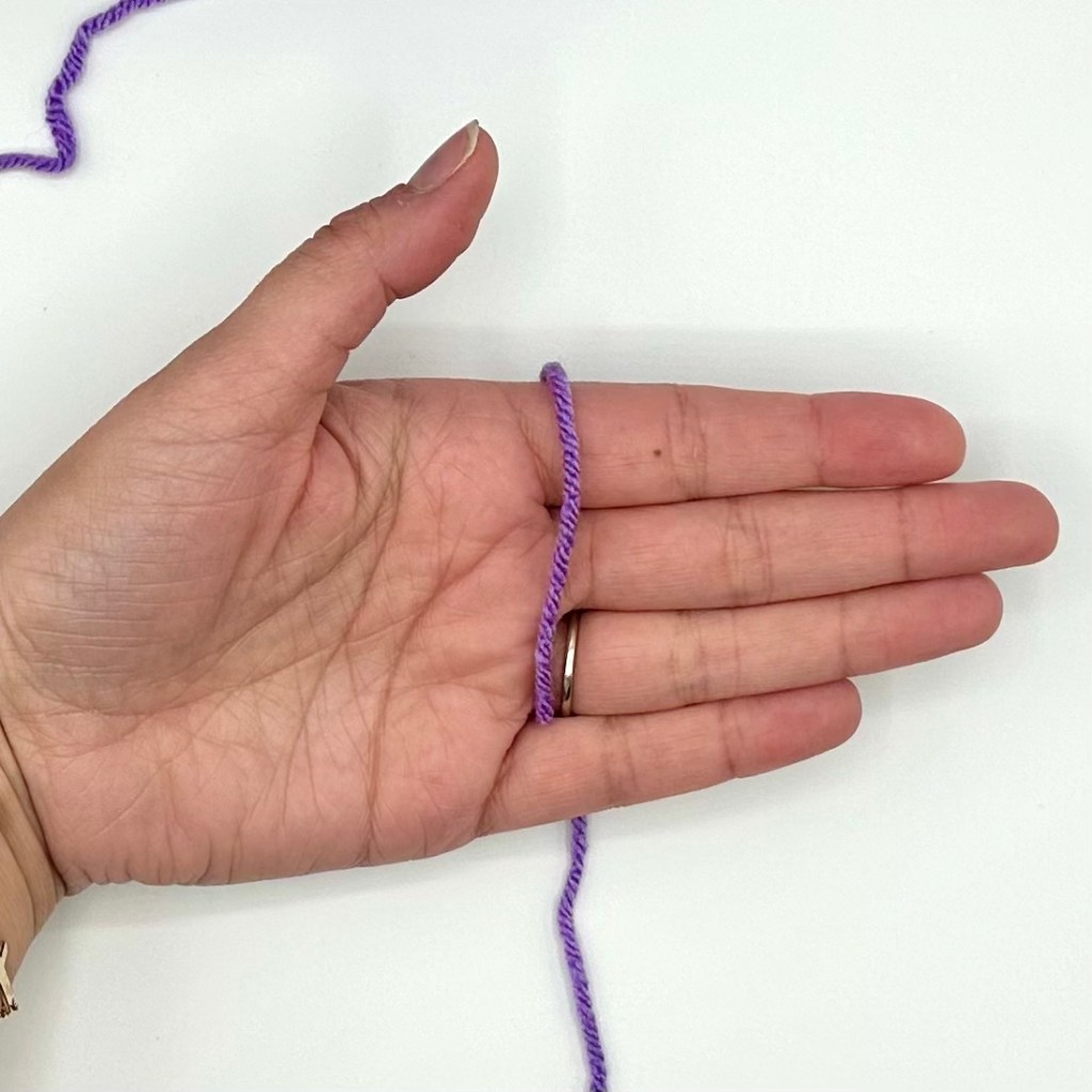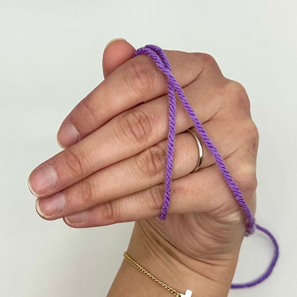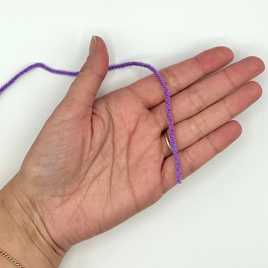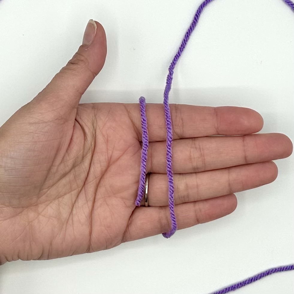 - With your hand palm-side up, lay the yarn across your hand with its end laying toward your pinky finger.
