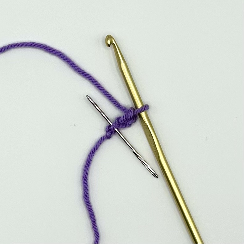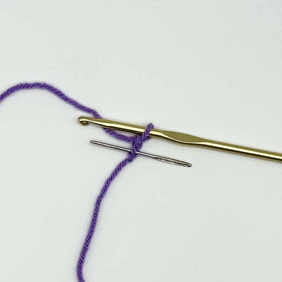 2. A slip stitch join will be placed into the first chain made to make a ring. (In the image, the needle marks this placement.)