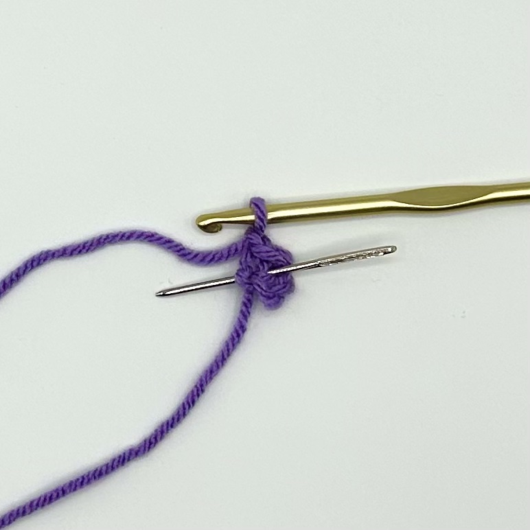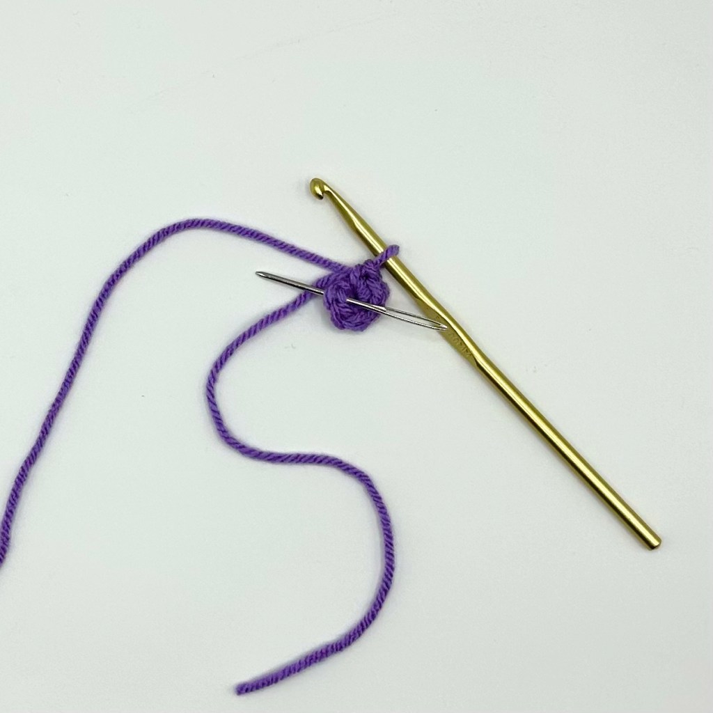 5. The stitches will be placed into the center of the ring created by the slip stitch join. (In the image, the needle marks this placement.)