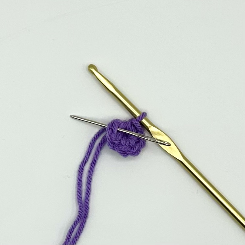 15. To close off the circle a slip stitch will be placed into the first stitch of the round. (In the image, the needle marks this placement.)