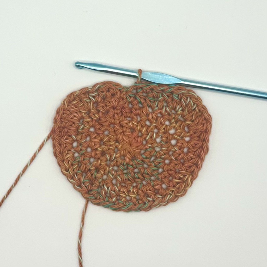 *Yarn used for the pumpkin body. Main photo: Premier Cotton in color Tangerine Splash. Pattern photos: Crafter’s Secret Cotton in color Auburn Clay. Scrap cotton yarn was used for the stem, leaf and vine.