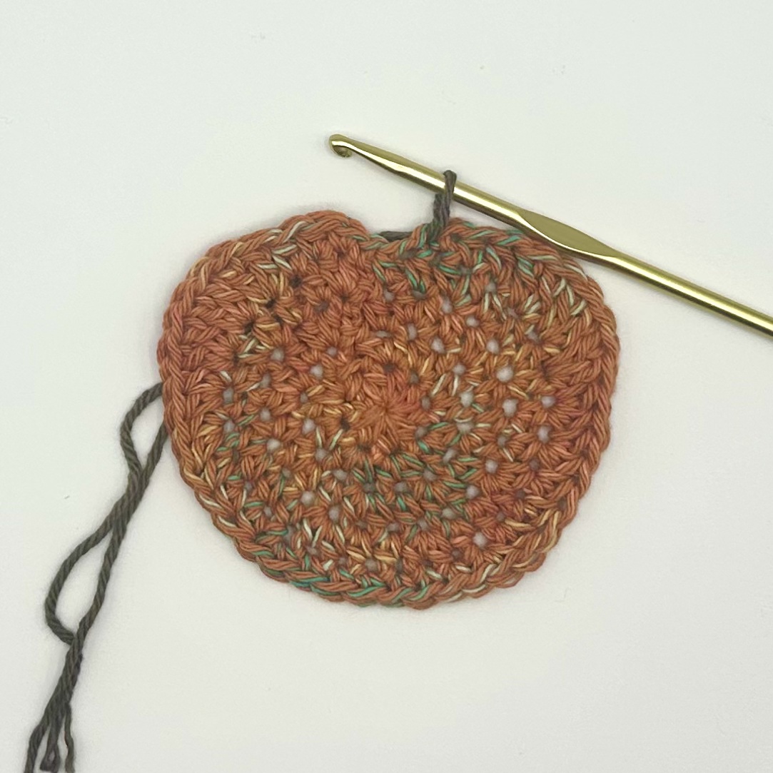 Row Three: CH1. (HDC)*. SS into the stitch left to the center, top of the pumpkin body. (3sts)
