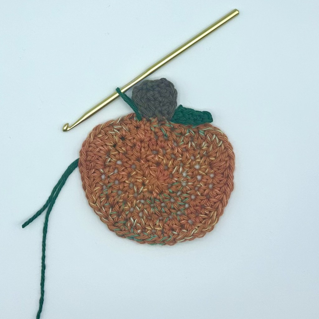 The stem, leaf and vine are worked in row(s). The pumpkin body is worked in-the-round. The last round of the pumpkin is where the pumpkin shape will be made. Beginning chain(s) do NOT count as a stitch. Therefore, the first stitch will be worked in the same stitch as beginning chain(s) unless otherwise specified.
